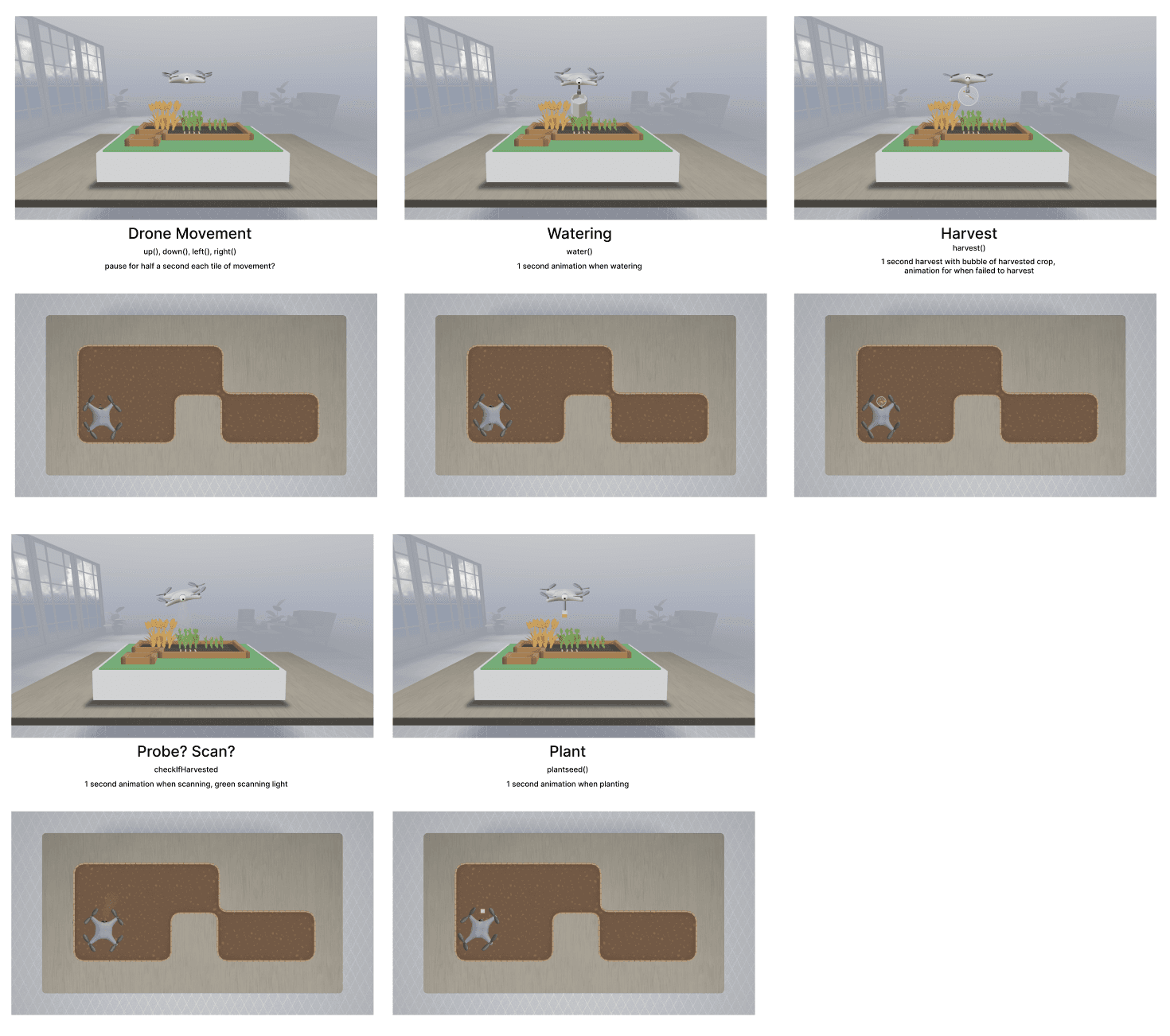 Each gameplay stage builds on the previous one: drones begin idle, receive instructions, perform actions, and unlock new capabilities as the player progresses. Showing all drone stages side-by-side highlights how complexity grows over time, reinforcing learning through visible system behavior rather than tutorials or text-heavy explanations.