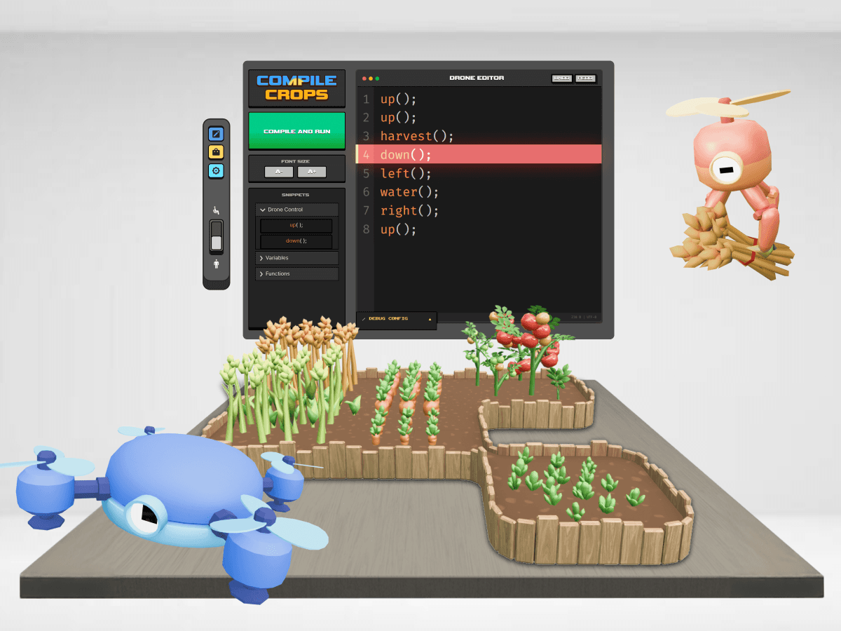 Compile Crops is a mixed-reality edutainment farming simulator built with Meta’s Spatial SDK. Place your plot on your desk or floor, deploy drones, and write code that control how your drones plant, water, and harvest. As you expand your farm, you learn programming fundamentals like loops, conditions, sequencing, and automation through direct spatial feedback.