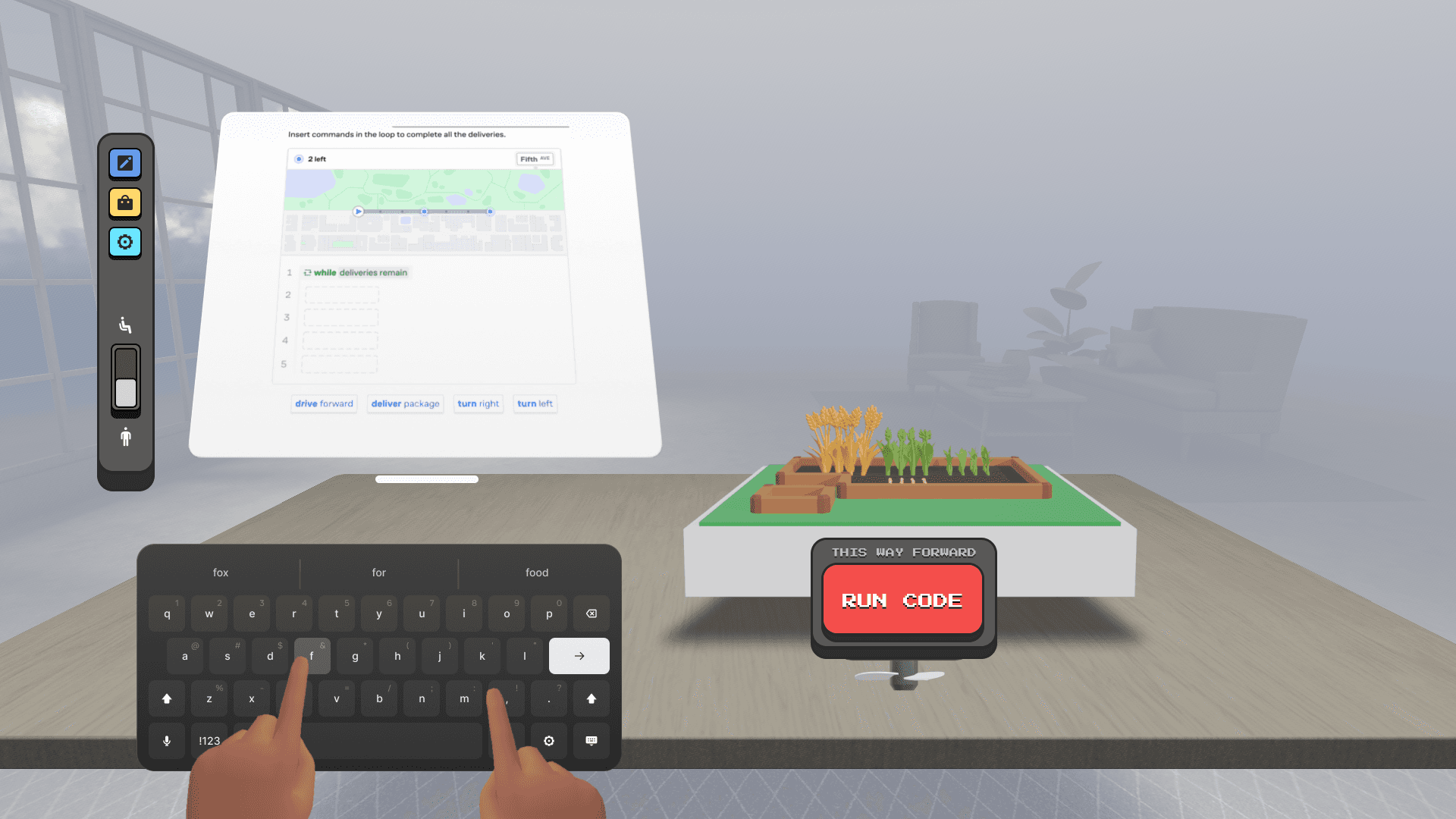 We started by storyboarding the experience from a UX perspective, mapping how users would move between learning, interaction, and feedback. We landed on a farming simulator as the core metaphor because it naturally supports progression, repetition, and visible cause and effect. The biggest open question was how to make coding feel accessible through hand tracking. We explored keyboard input early on, but ultimately shifted toward drag-and-drop coding blocks that could be placed spatially, allowing users to focus on logic rather than syntax.